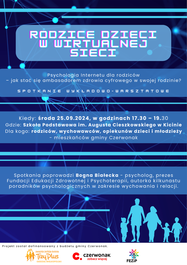 Zapraszamy na spotkanie wykładowo-warsztatowe w ramach projektu „Rodzice dzieci w wirtualnej sieci”. Celem projektu jest rozwijanie kompetencji rodziców, wychowawców, opiekunów dzieci i młodzieży - mieszkańców gminy Czerwonak w zakresie towarzyszenia dzieciom i młodzieży w bezpiecznym korzystaniu ze świata wirtualnego, pomoc rodzicom w wypracowaniu domowych zasad tzw. higieny cyfrowej, poszerzanie wiedzy dotyczącej czynników związanych z ryzykiem uzależnienia od ekranów i technowypalenia. Realizowane zajęcia dostarczają narzędzi i rozwijają umiejętności pomagające zapobiegać nadmiernemu korzystaniu z urządzeń ekranowych.