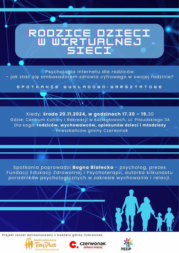 Tym razem zapraszamy do CKiR w Koziegłowach na ostanie spotkanie w ramach naszego projektu "Rodzice dzieci w wirtualnej sieci". 20.11.2024 (środa) zapraszamy wszystkich, którzy nie byli na poprzednich spotkaniach: rodziców, nauczycieli, wychowawców, opiekunów dzieci i młodzieży. Spotkanie rozpoczynamy o 17:30. Czeka na Was dużo przydatnej wiedzy i praktycznych wskazówek jak dbać o zdrowie cyfrowe w swoich rodzinach.